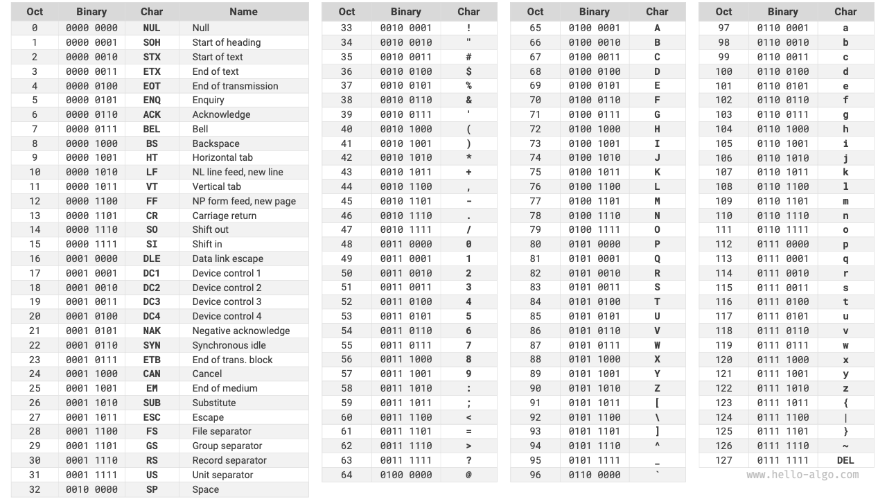 コンピュータシステムでは、すべてのデータが二進形式で格納され、charも例外ではありません。文字を表現するために、各文字と二進数の一対一のマッピングを定義する「文字セット」を開発する必要があります。文字セットがあれば、コンピュータは表を参照して二進数を文字に変換できます。