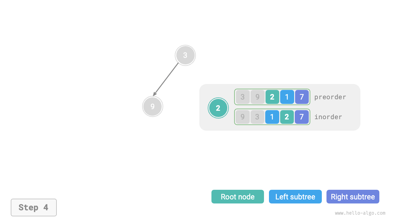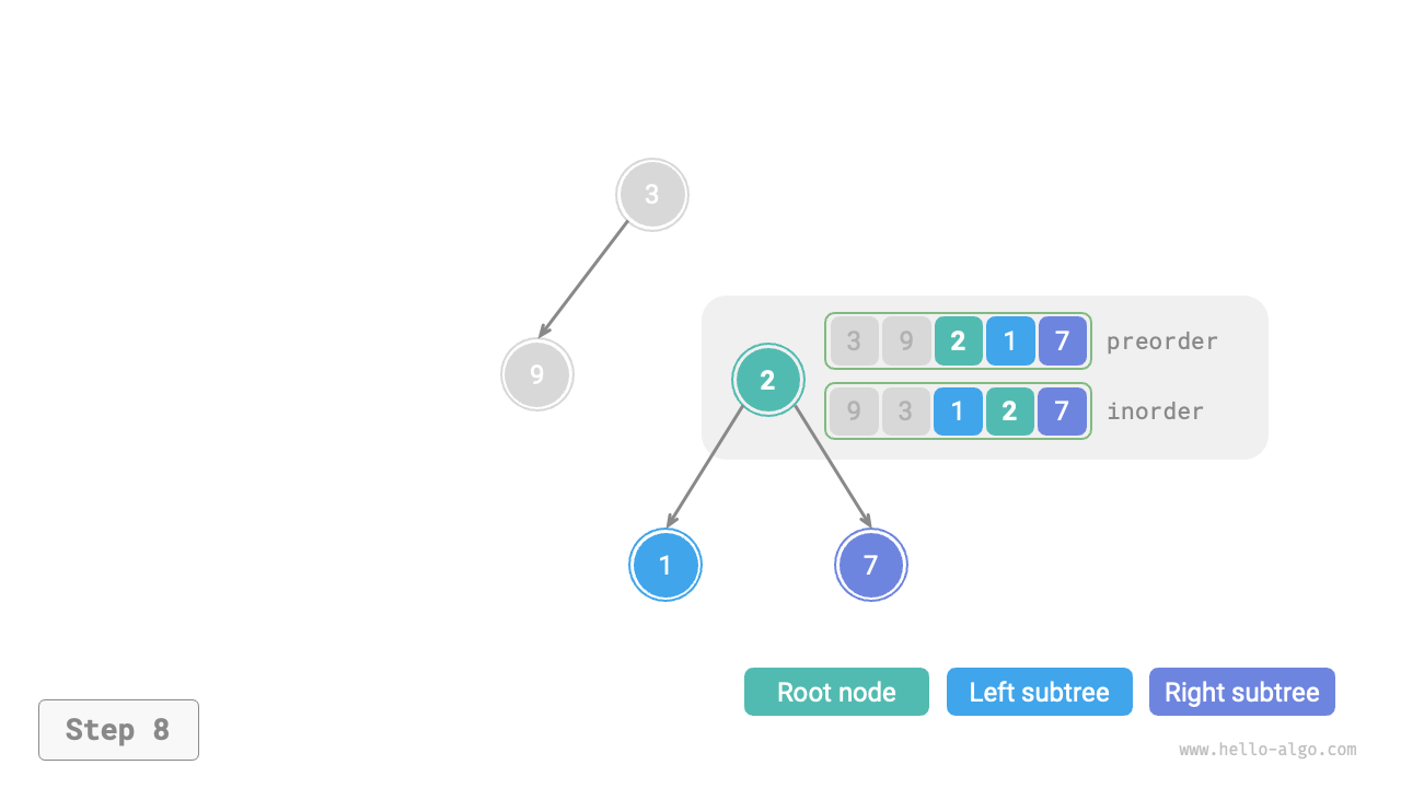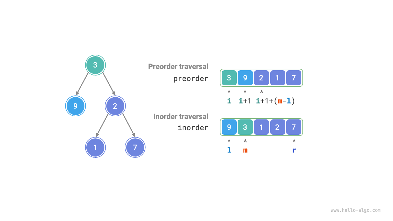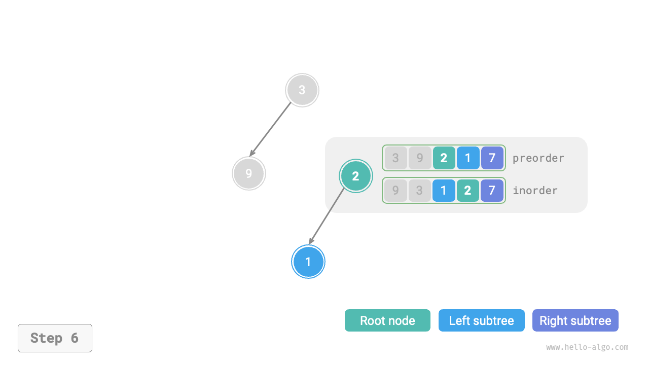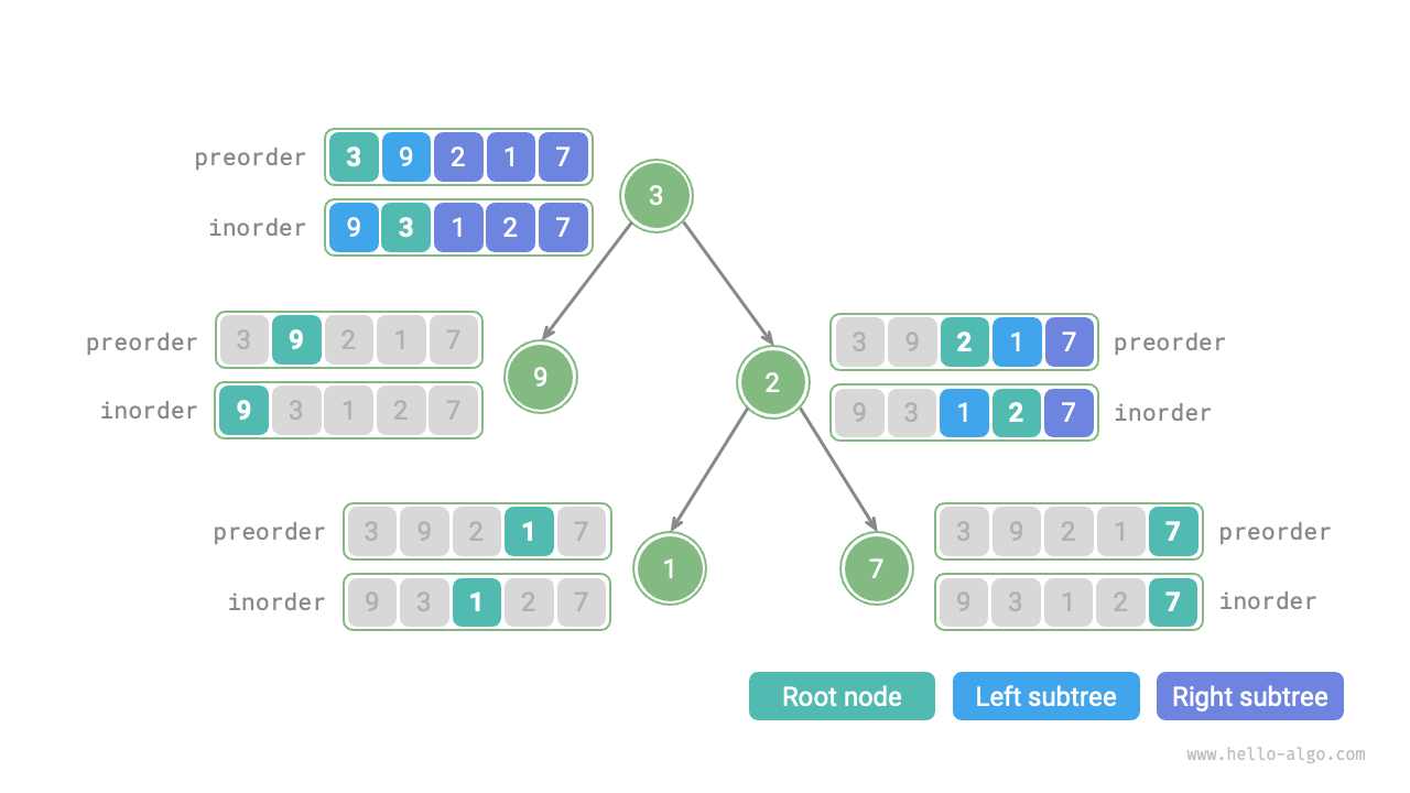 - 部分問題は独立している:左と右の部分木は重複しません。左の部分木を構築する際、左の部分木に対応する中順走査と前順走査のセグメントのみが必要です。右の部分木にも同じアプローチが適用されます。