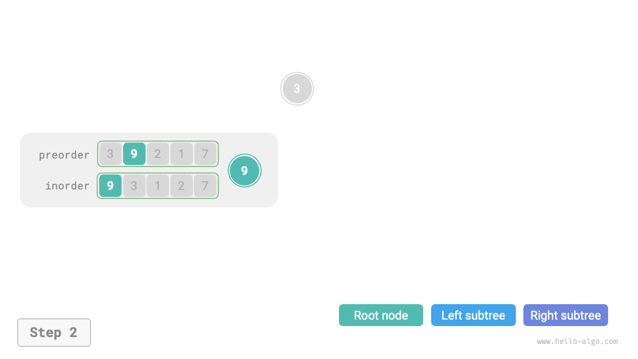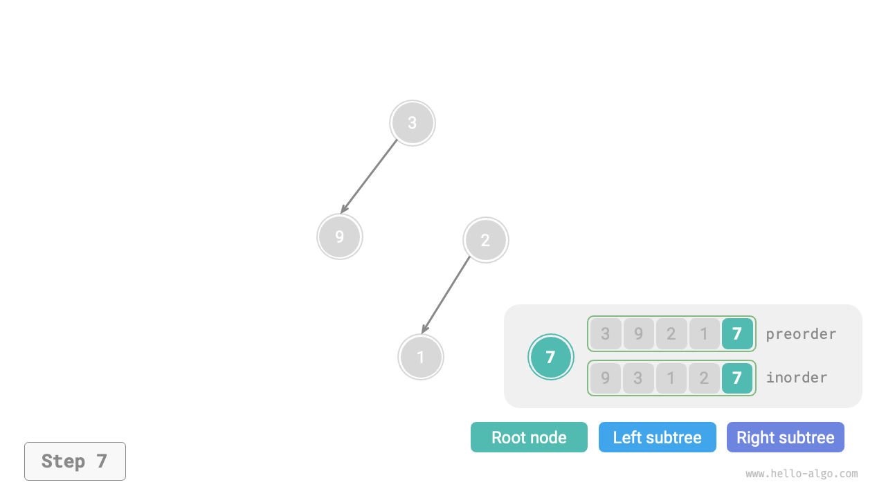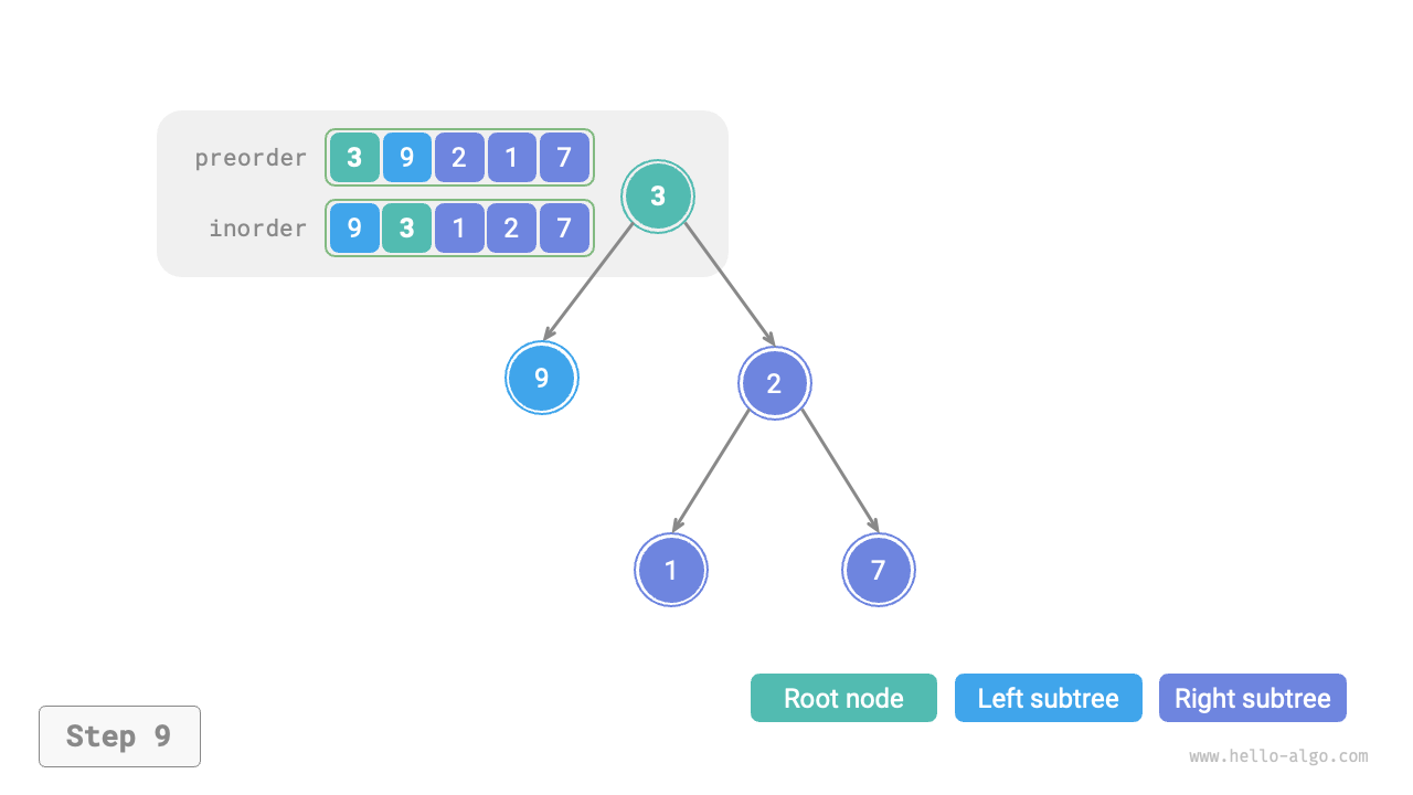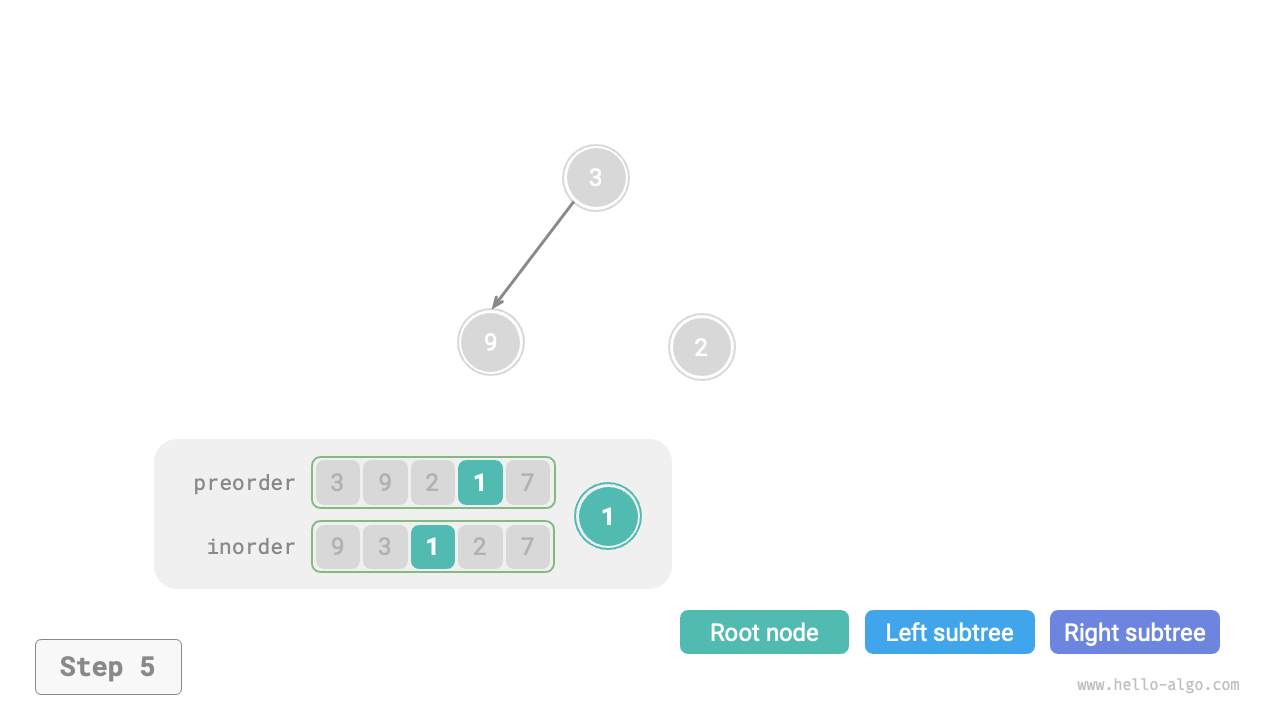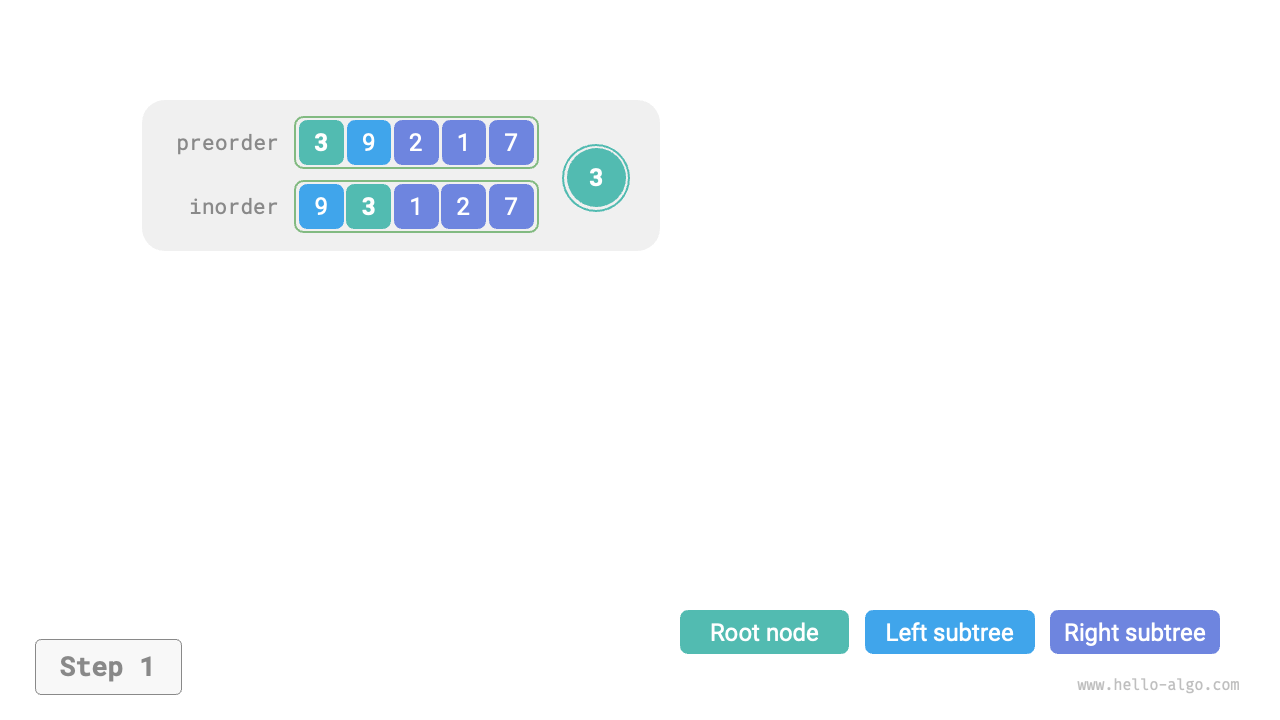 - 部分問題は独立している:左と右の部分木は重複しません。左の部分木を構築する際、左の部分木に対応する中順走査と前順走査のセグメントのみが必要です。右の部分木にも同じアプローチが適用されます。