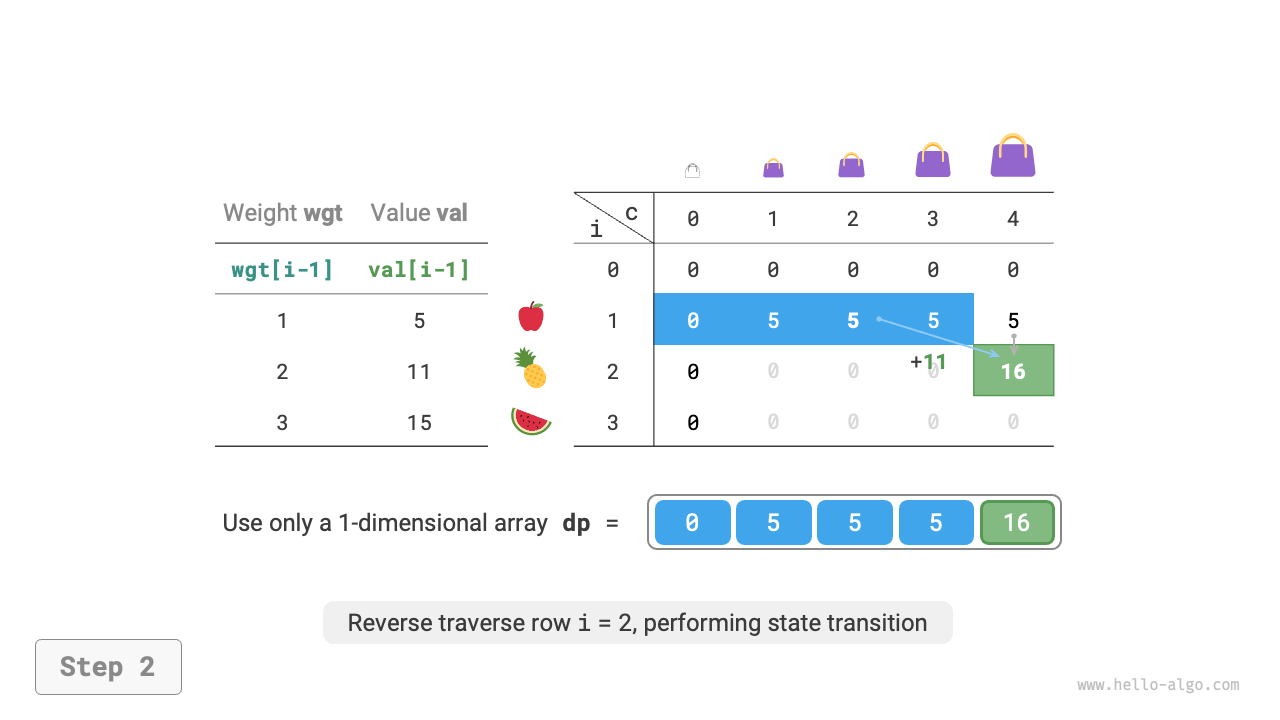 さらに考えてみると、1つの配列だけで空間最適化を達成できるでしょうか?各状態が直接上のセルまたは左上のセルから遷移することが観察できます。配列が1つしかない場合、\(i\) 行目の走査を開始するとき、その配列はまだ \(i-1\) 行目の状態を保存しています。