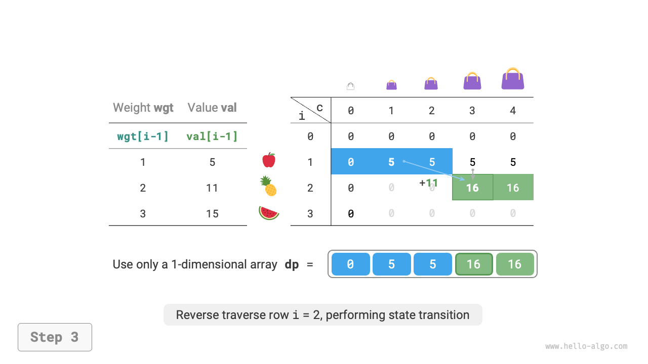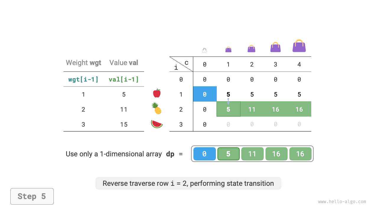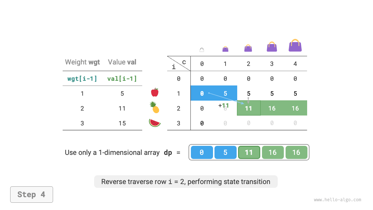 図 14-21 0-1ナップサックの空間最適化動的プログラミングプロセス
