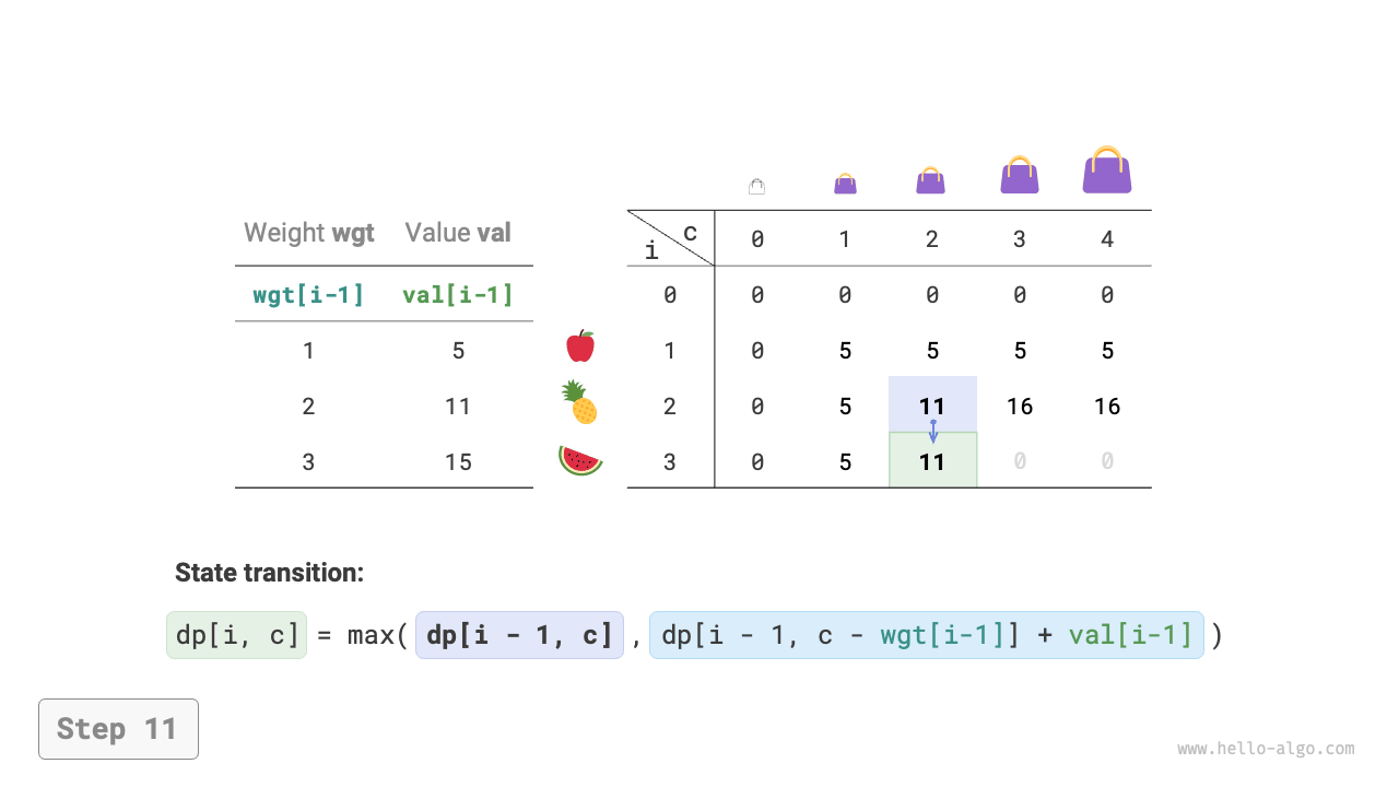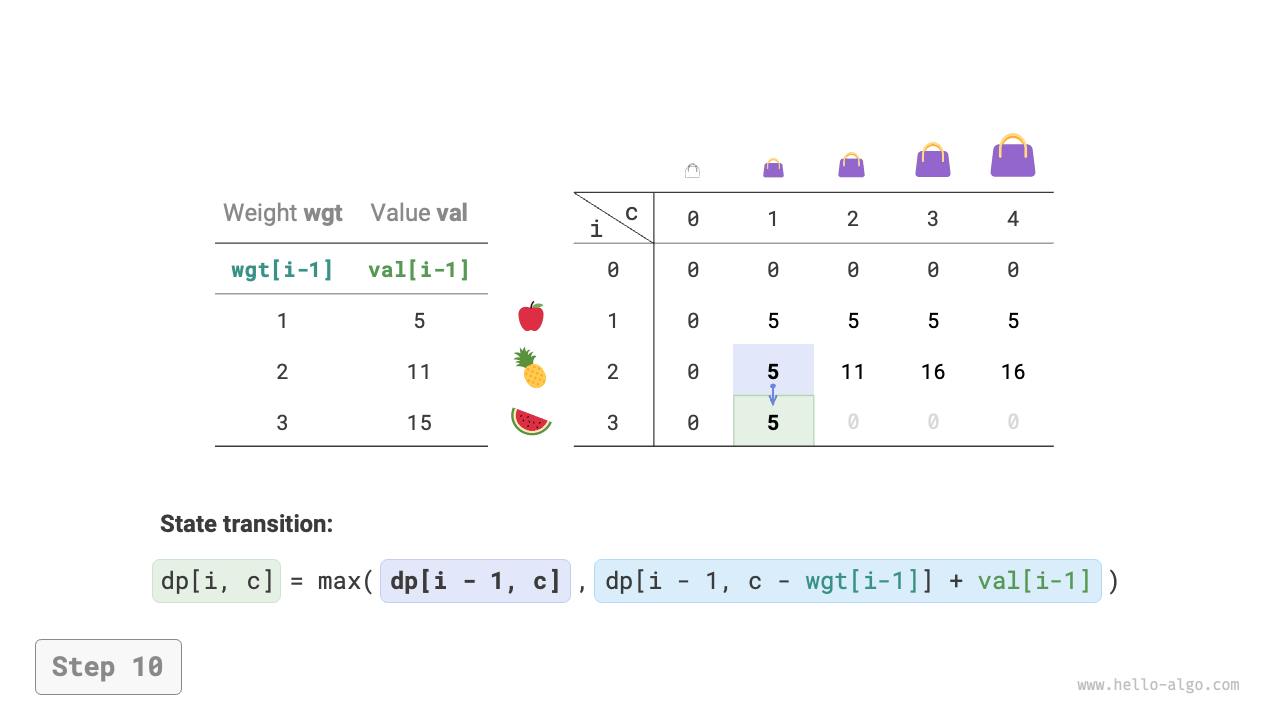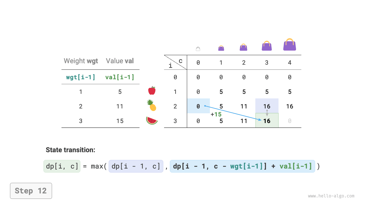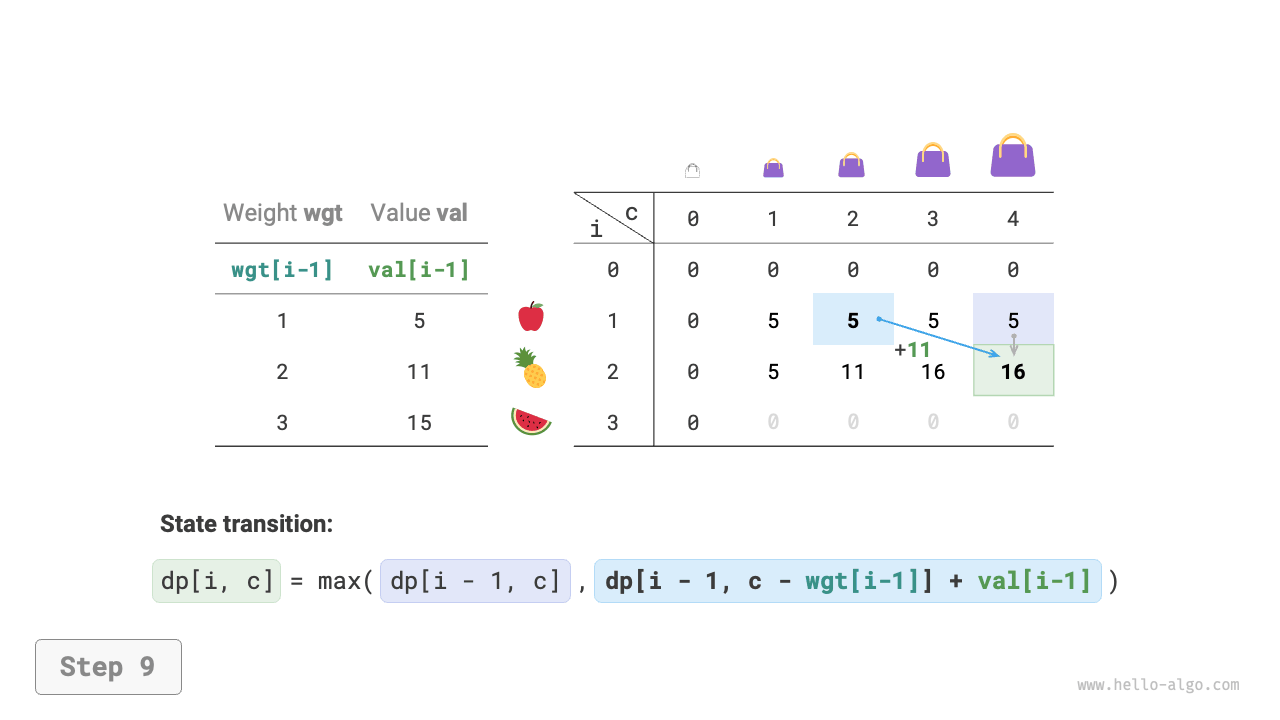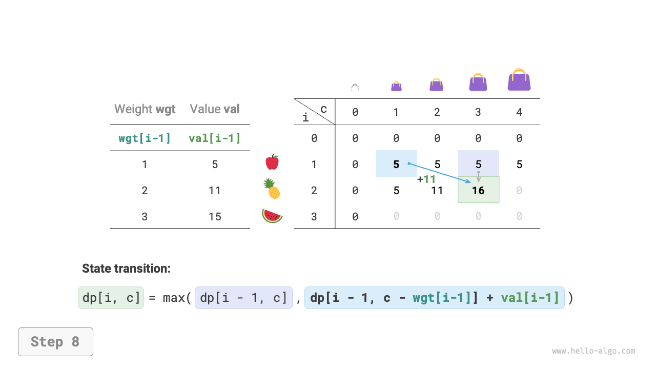 状態 \([i, c]\) は部分問題に対応します:容量 \(c\) のナップサックでの最初の \(i\) 個のアイテムの最大値、\(dp[i, c]\) と表記されます。