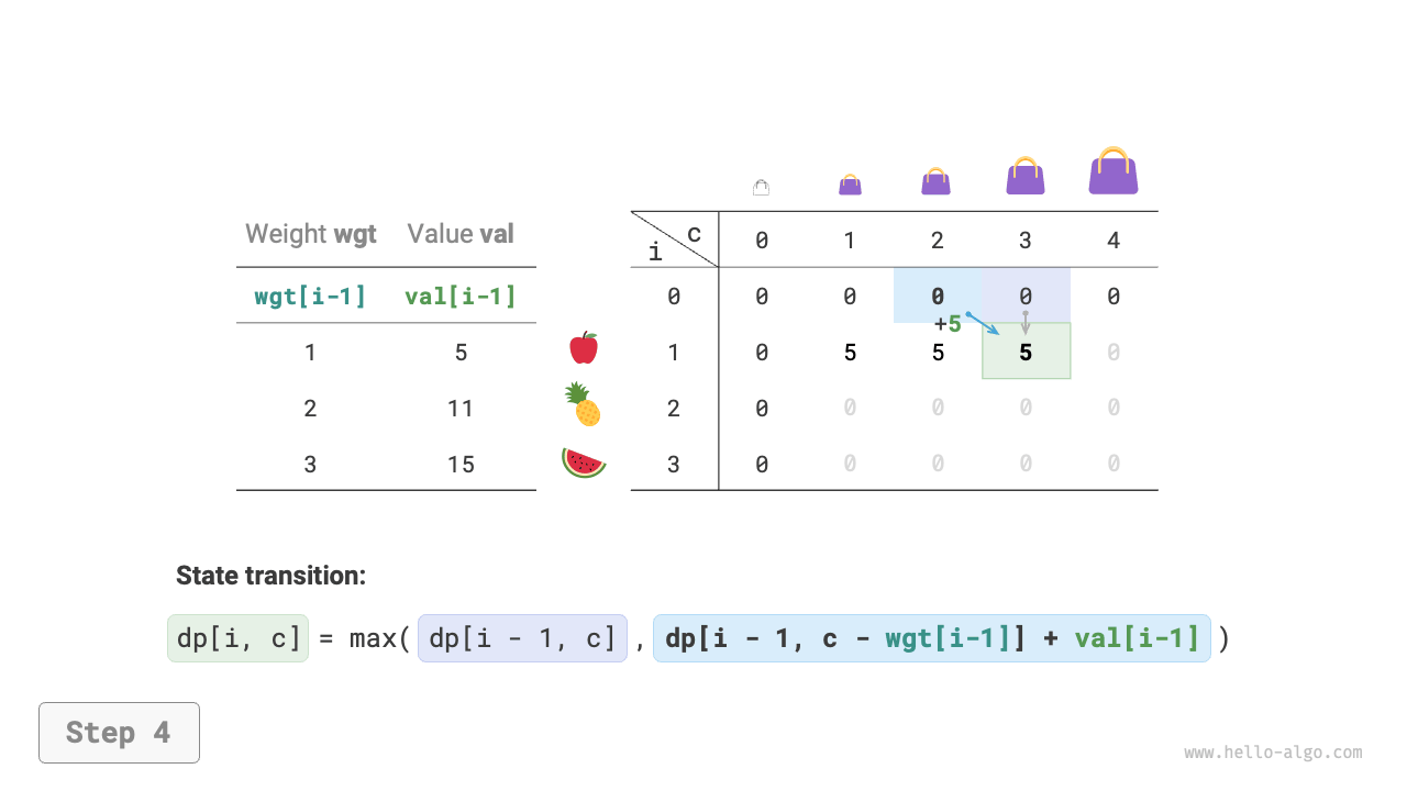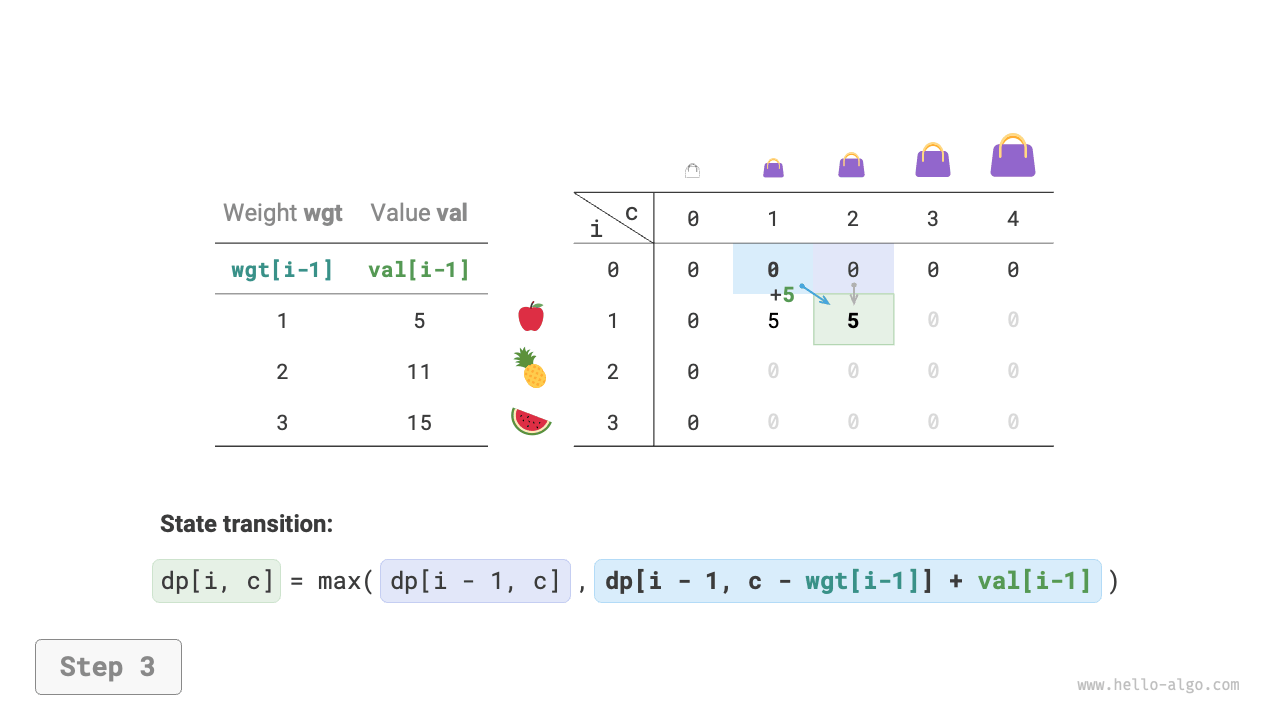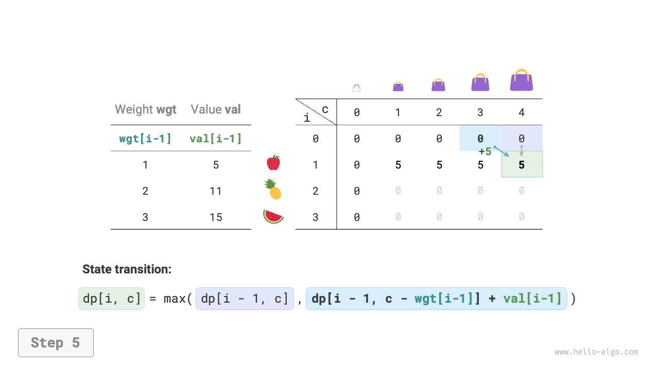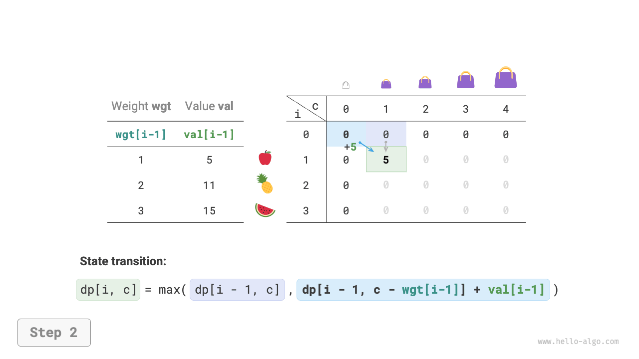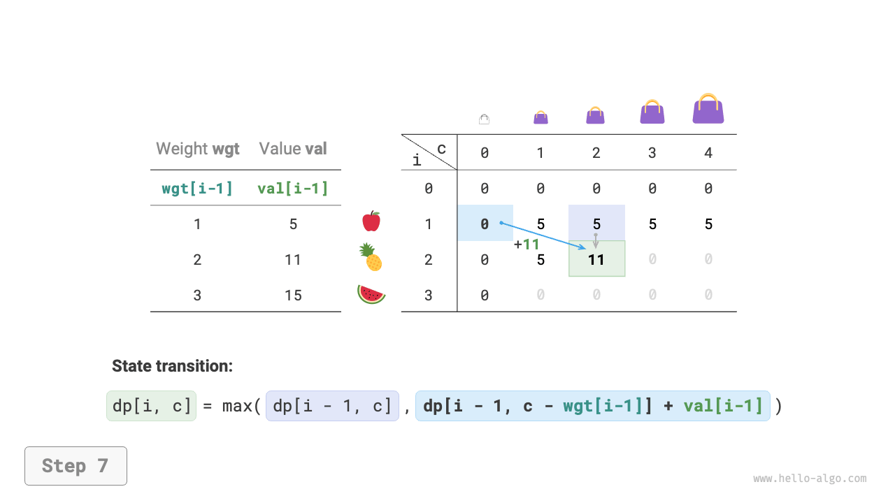 状態 \([i, c]\) は部分問題に対応します:容量 \(c\) のナップサックでの最初の \(i\) 個のアイテムの最大値、\(dp[i, c]\) と表記されます。