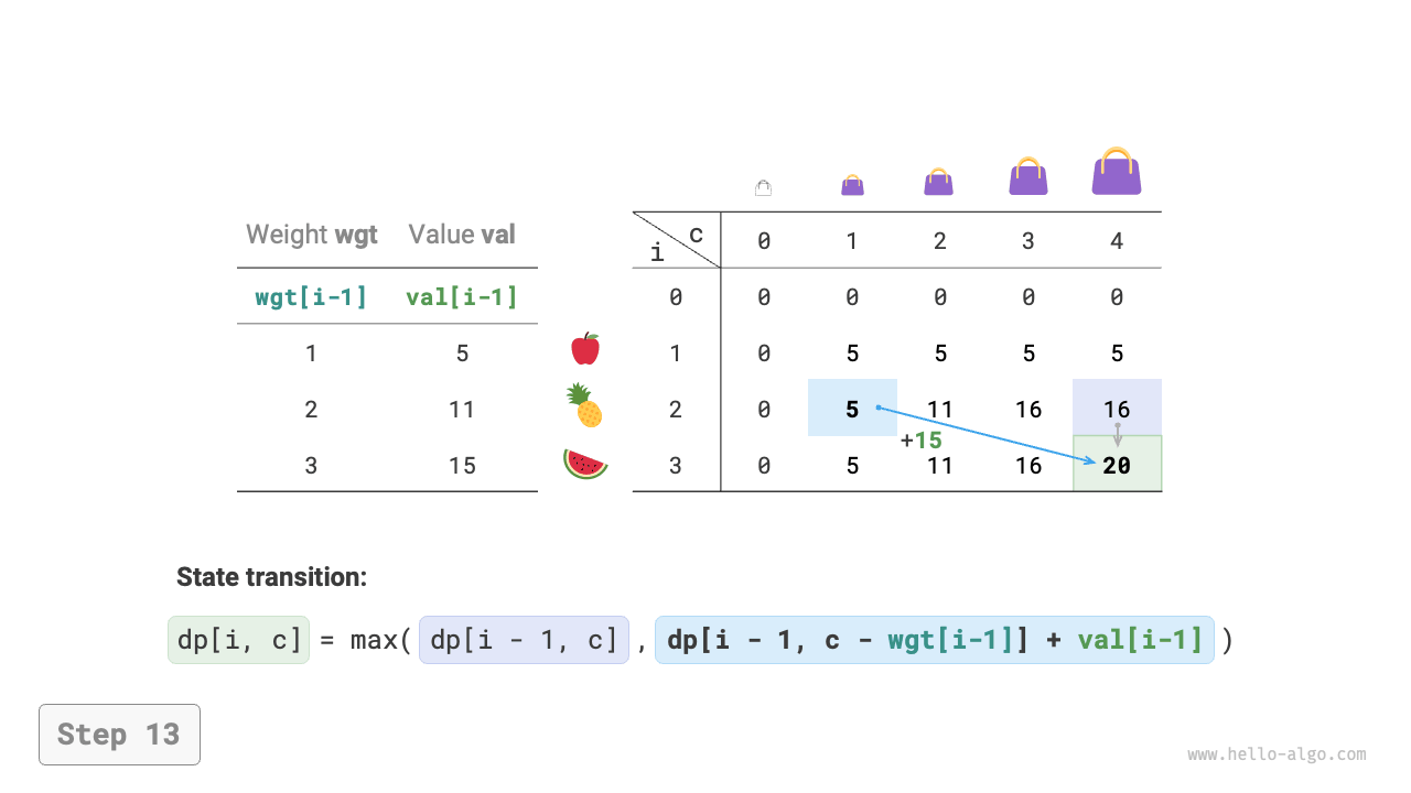 上記の分析により、この問題の最適部分構造が明らかになります:最大値 \(dp[i, c]\) は、アイテム \(i\) を入れない方案とアイテム \(i\) を入れる方案の2つのうち、より大きな値に等しい。これから状態遷移方程式を導出できます: