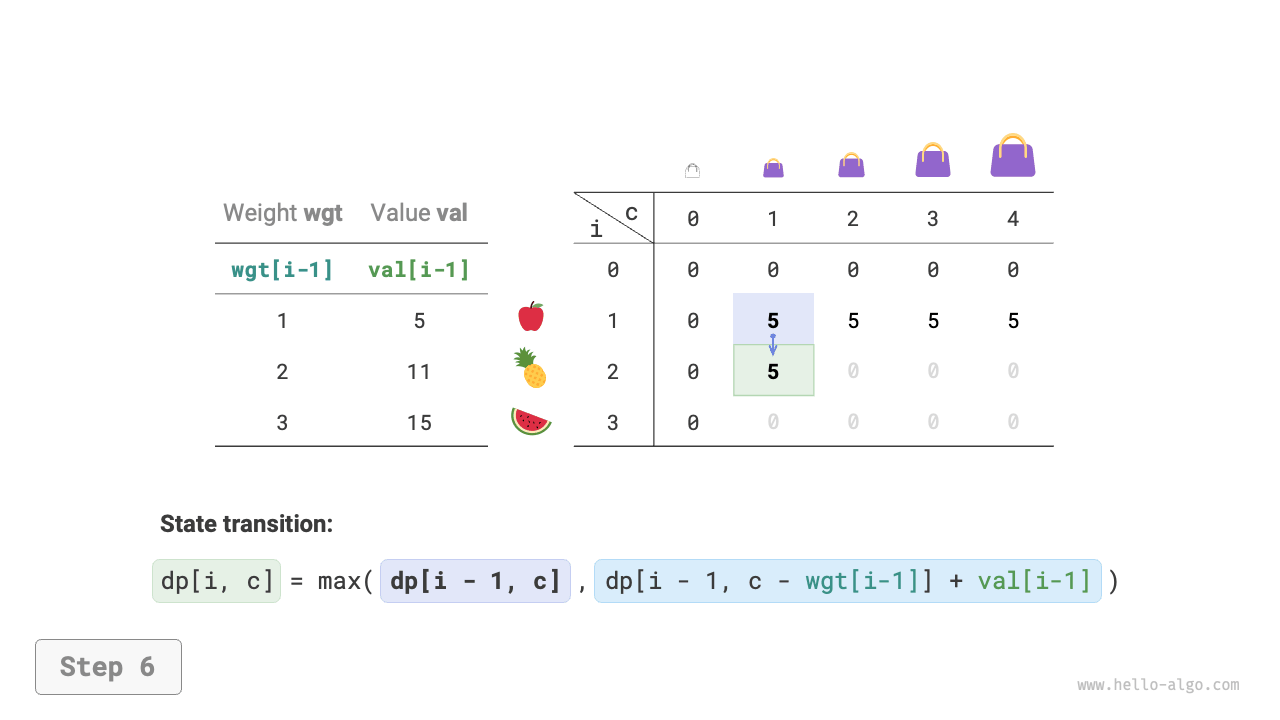 各アイテムについて、ナップサックに入れなければ容量は変わらず、入れれば容量は減少します。これから状態定義を得ることができます:現在のアイテム番号 \(i\) とナップサック容量 \(c\)、\([i, c]\) と表記されます。