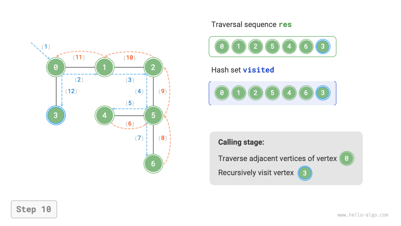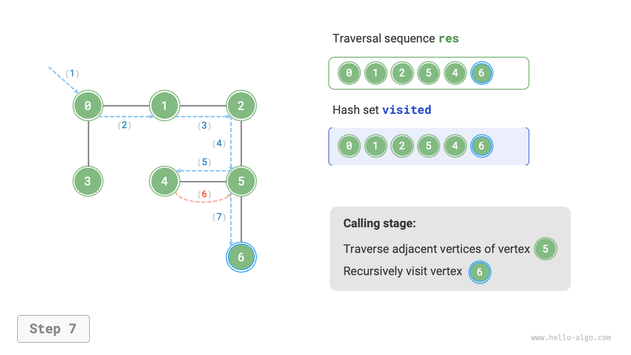 この「可能な限り遠くまで行ってから戻る」アルゴリズムパラダイムは通常再帰に基づいて実装されます。幅優先探索と同様に、深さ優先探索でも、再訪問を避けるために訪問済み頂点を記録するハッシュセットvisitedの助けが必要です。