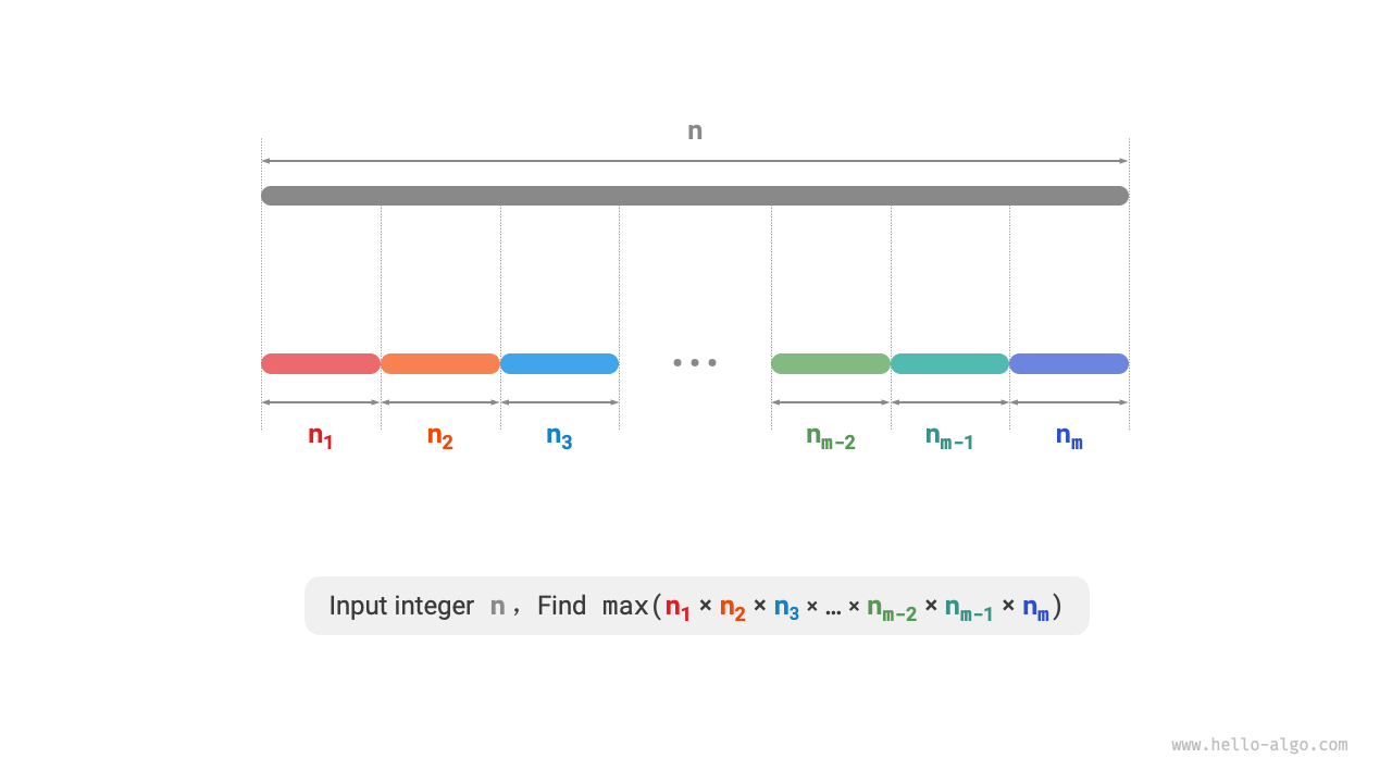 正の整数 \(n\) が与えられたとき、それを合計が \(n\) になる少なくとも2つの正の整数に分割し、これらの整数の最大積を求めてください。下の図に示すとおりです。