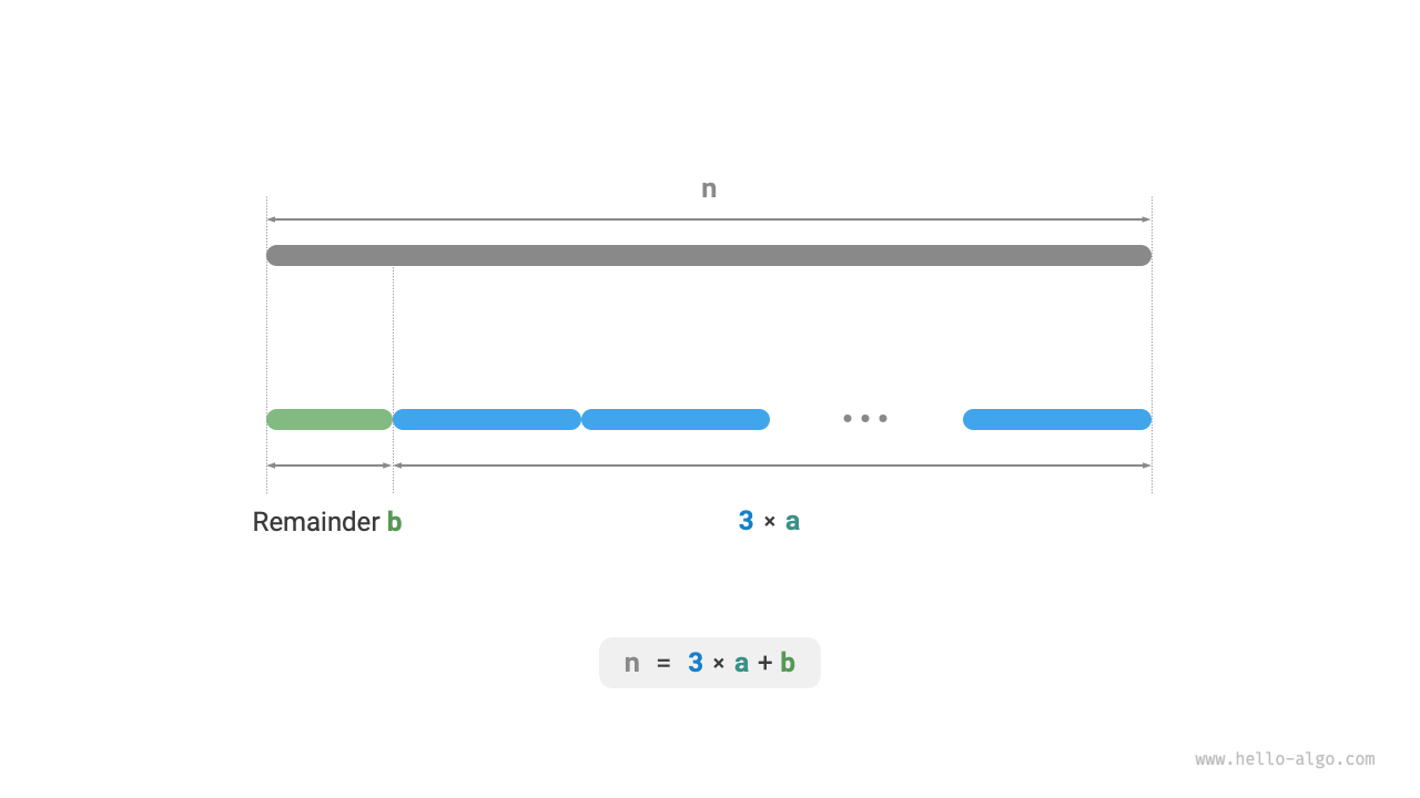 下の図に示すように、整数を分割するためにループを使用する必要はなく、床除算演算を使用して \(3\) の数 \(a\) を取得し、剰余演算を使用して余り \(b\) を取得できます。したがって: