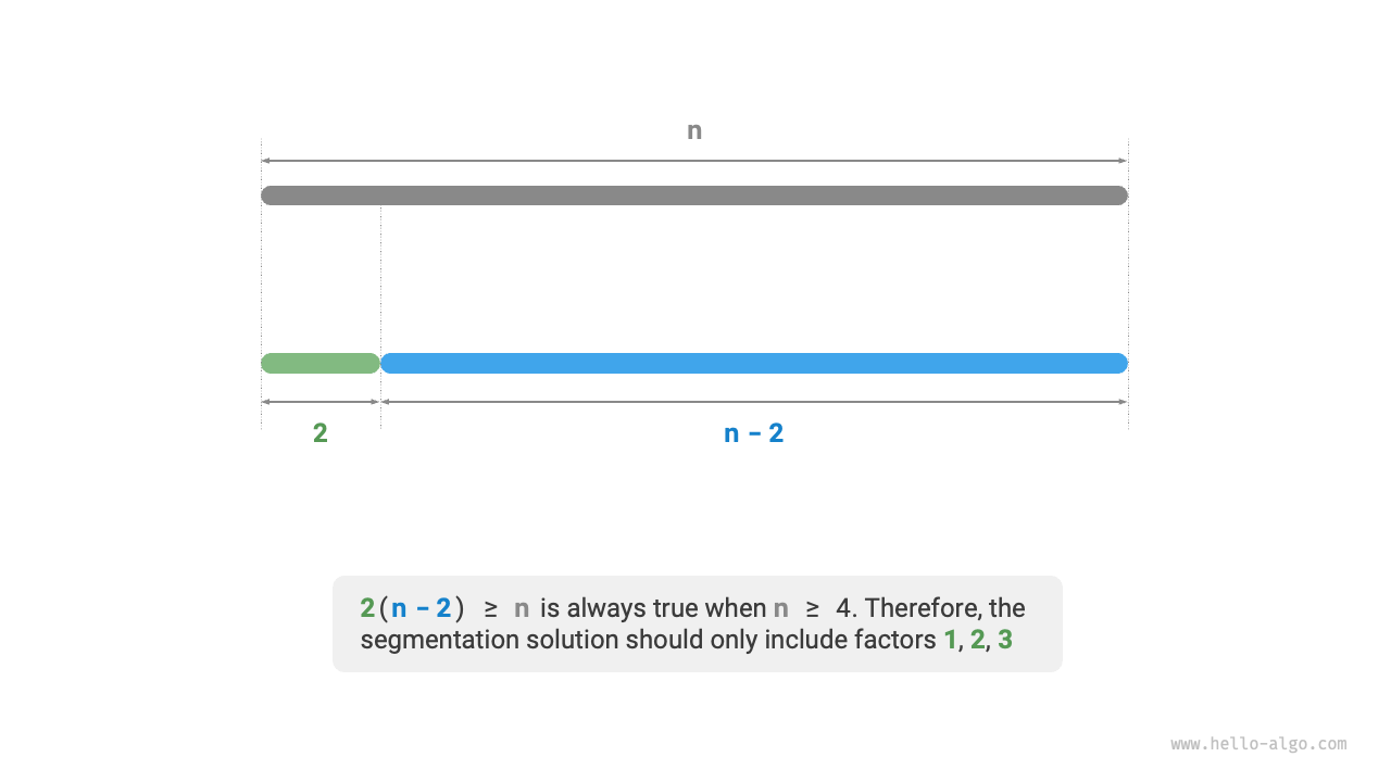下の図に示すように、\(n \geq 4\) のとき、\(2\) を分割すると積が増加します。これは4以上の整数を分割すべきであることを示しています。