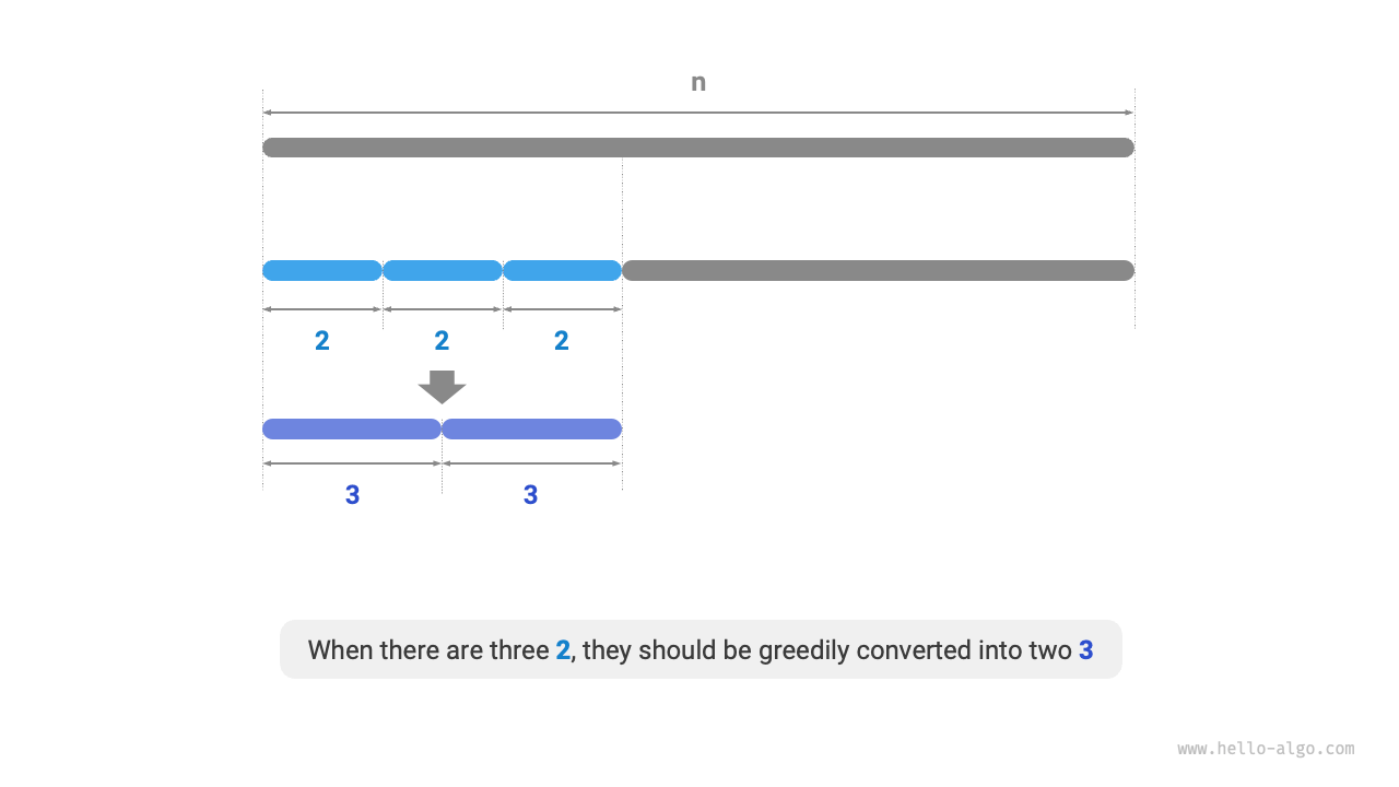 貪欲戦略2:分割スキームには最大で2つの \(2\) があるべきです。3つの \(2\) は常に2つの \(3\) に置き換えてより高い積を得ることができるからです。
