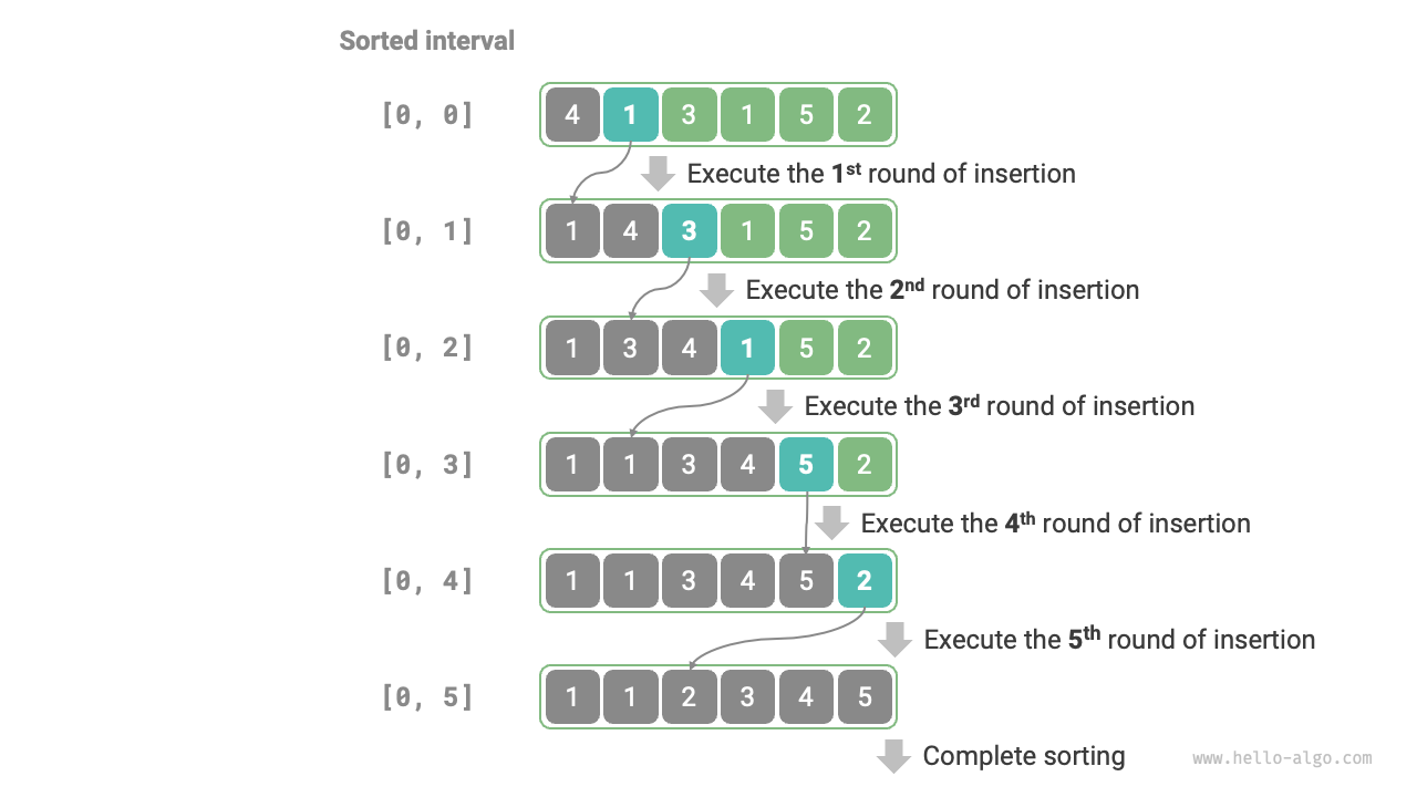 - 時間計算量は\(O(n^2)\)、適応ソート:最悪の場合、各挿入操作には\(n - 1\)、\(n-2\)、...、\(2\)、\(1\)のループが必要で、合計は\((n - 1) n / 2\)となり、時間計算量は\(O(n^2)\)です。順序付きデータの場合、挿入操作は早期に終了します。入力配列が完全に順序付けられている場合、挿入ソートは最良時間計算量\(O(n)\)を実現します。