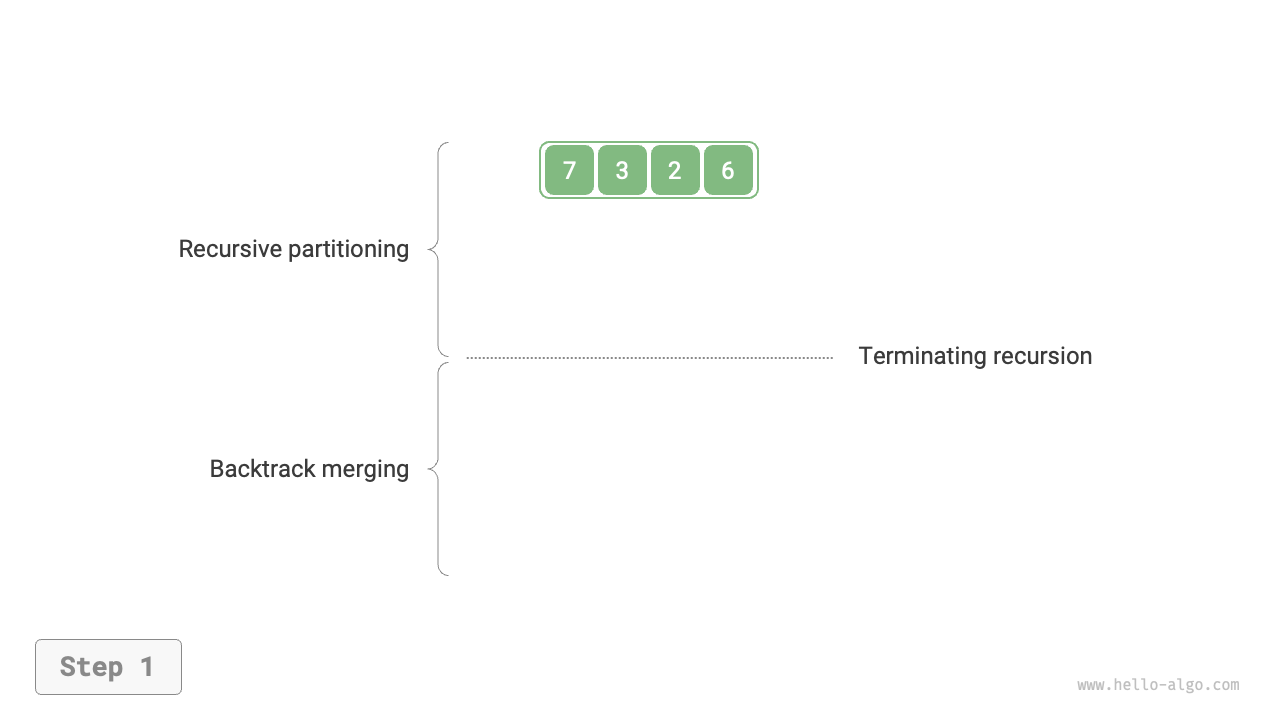 )を再帰的に分割します。 - サブ配列の長さが1になるまでステップ