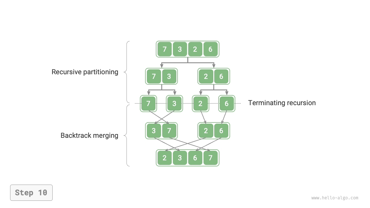 - \(O(n)\)の空間計算量、非インプレースソート:再帰深度は\(\log n\)で、\(O(\log n)\)のスタックフレーム空間を使用します。マージ操作には補助配列が必要で、追加の\(O(n)\)空間を使用します。